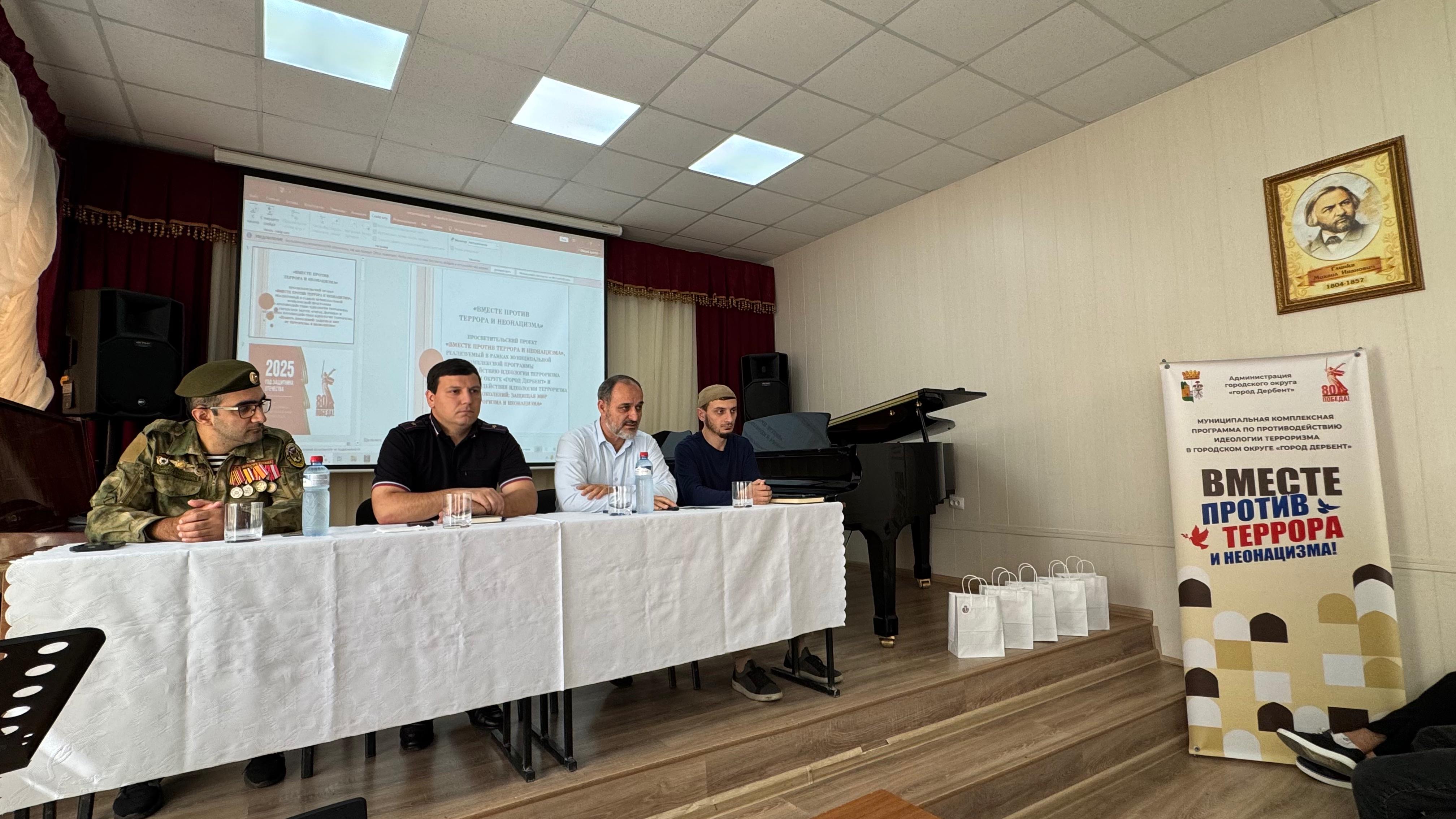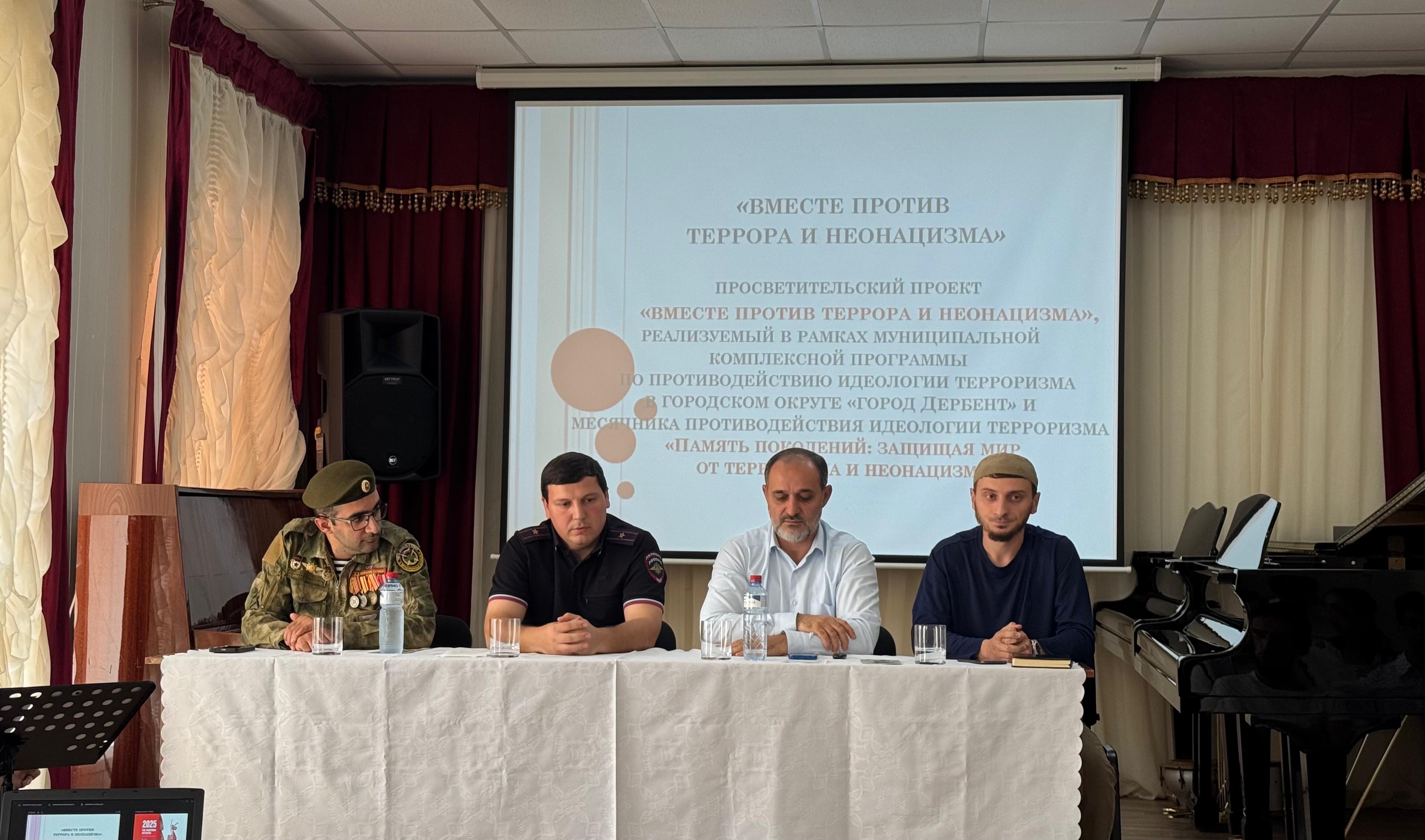 Спикерами встречи стали: начальник отдела по обеспечению антитеррористической комиссии Абумуслим Ханмагомедов; сотрудник отдела просвещения при Муфтияте города Дербент Малик Давудов; старший участковый уполномоченный ОМВД города Дербент, майор полиции Эдгар Истарханов; участник специальной военной операции Григорий Газарян.