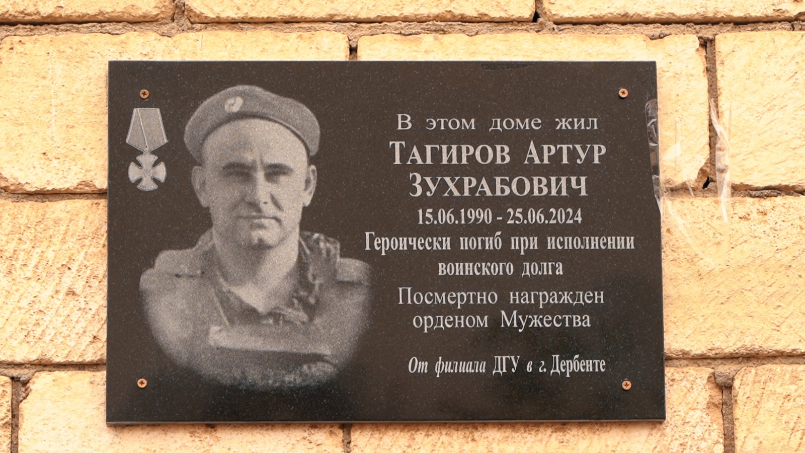 Сегодня, 28 апреля, на фасаде дома по адресу ул. Тахо-Годи, 33/4 в г. Дербенте состоялось открытие мемориальной доски в память о рядовом Тагирове Артуре Зухрабовиче, погибшем при исполнении воинского долга в ходе специальной военной операции.