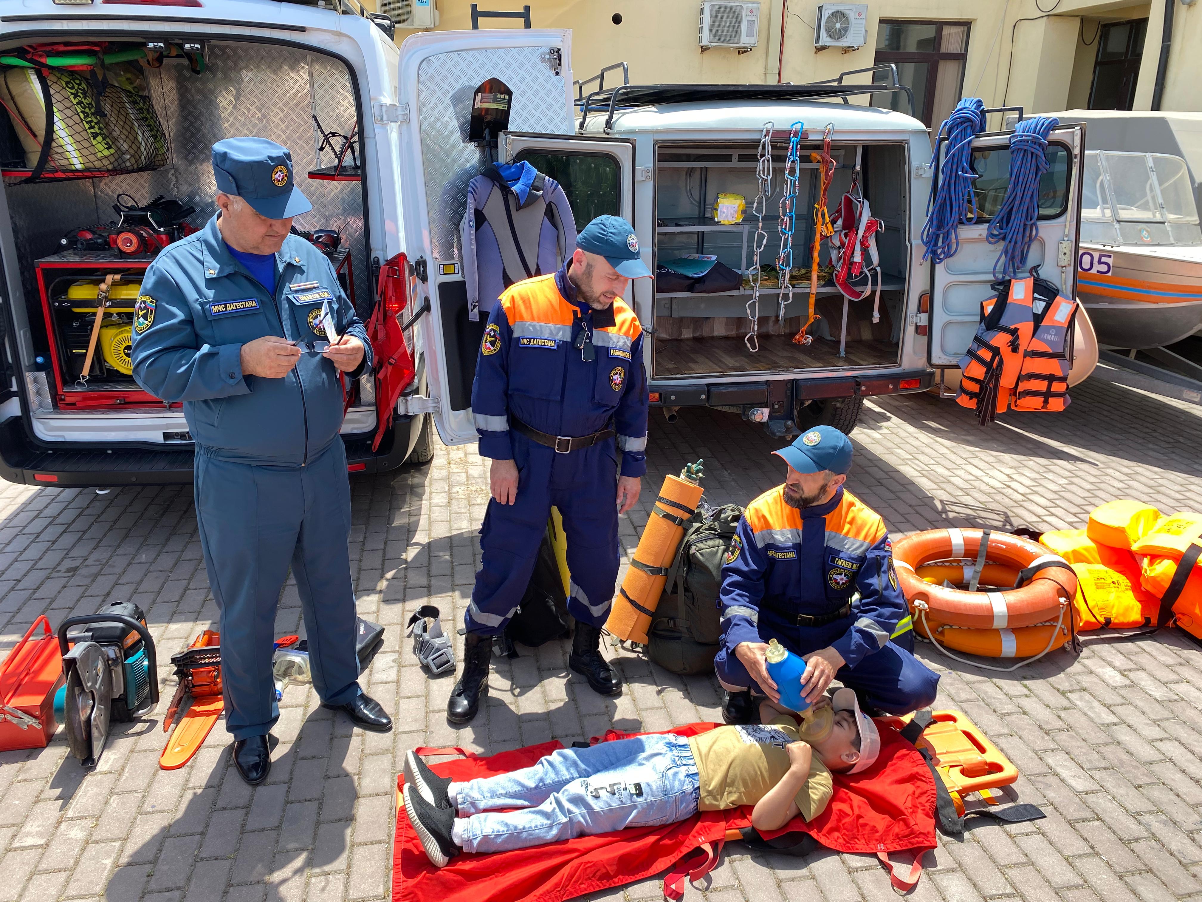 Заместитель начальника Дербентского поисково-спасательного подразделения Омар Омаров, спасатель 1 класса Максуд Гагаев и спасатель 2 класса Заур Рабаданов познакомили ребят с деятельностью подразделения, показали технику и снаряжения, рассказали об условиях их применения. Детям был продемонстрирован гидравлический аварийно-спасательный инструмент, показана работа других образцов аварийно-спасательной техники и оборудования. Им напомнили о правилах безопасности дома, в лесу, у воды, на улице, на транспорте, а также о способах оказания первой помощи и номерах телефонов экстренных служб.