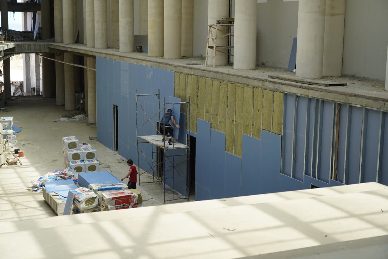 Параллельно ведётся благоустройство прилегающей территории: устанавливаются фасадные витражи, система автоматического пожаротушения, производится штукатурка колонн и ригелей, ведётся внутренняя облицовка стен и полов керамогранитом.