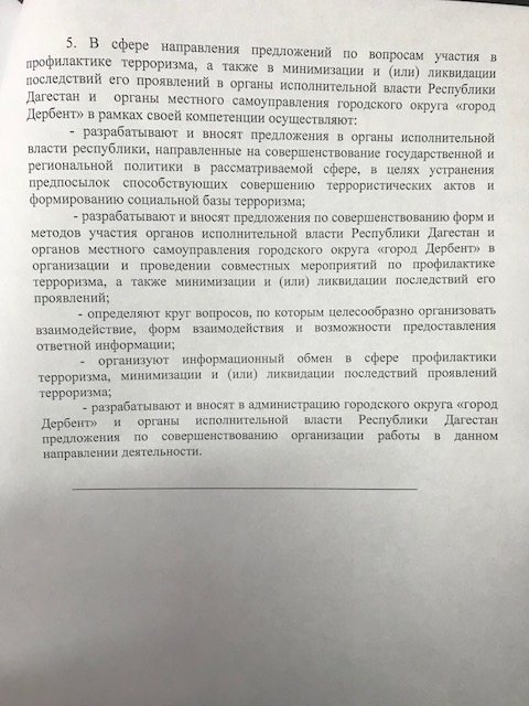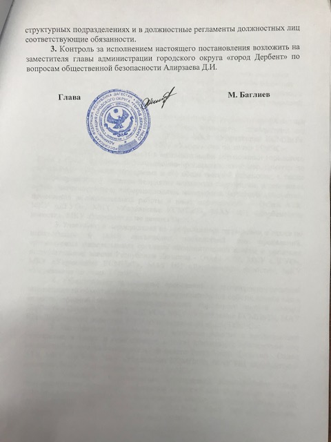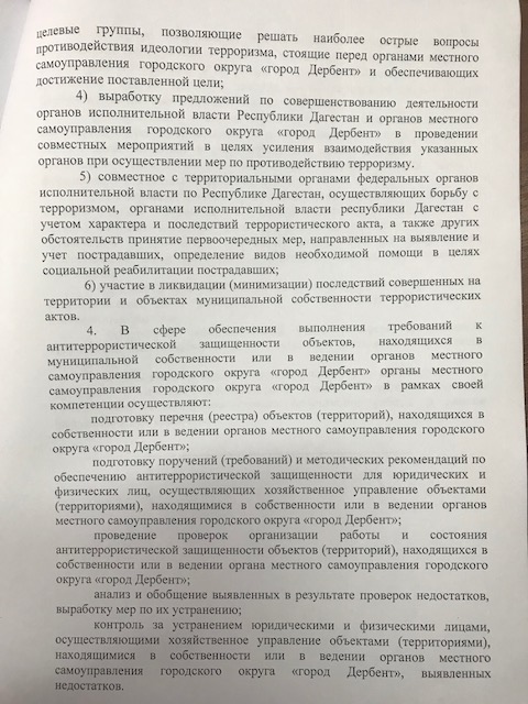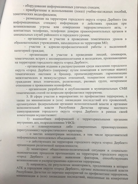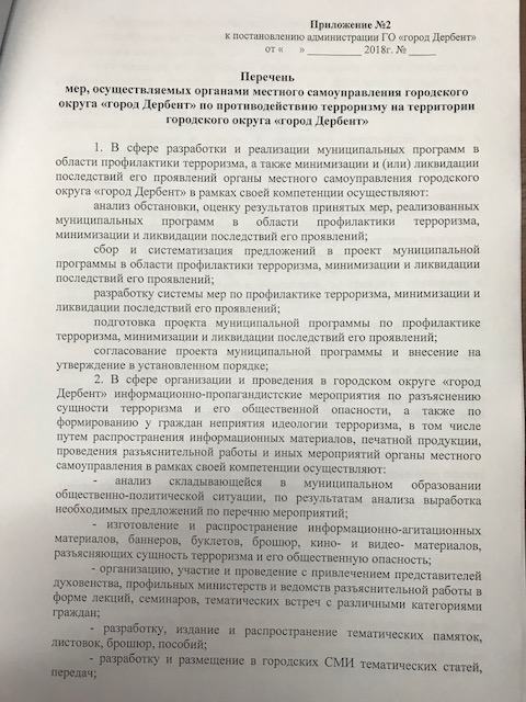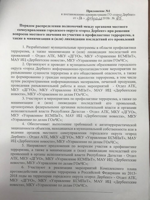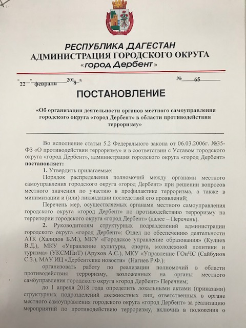 Постановление № 65 от 22.02.2018 г. "Об организации деятельности органов местного самоуправления го "город Дербент" в области противодействия терроризму"