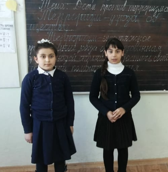 6 апреля 2018 года в рамках месячника «Три конфессии Дербента вместе против терроризма и экстремизма» в МБОУ СОШ №12 в 4 «а» был проведен классный час на тему: "Дети против терроризма", учитель: Магомедова Халида Кебировна.