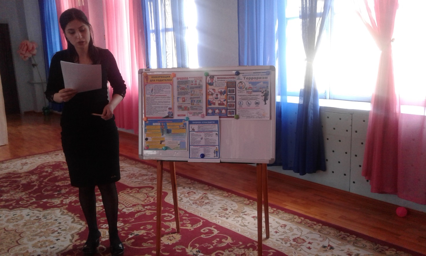 Воспитатель ознакомила родителей с правилами поведения в экстремальных ситуациях . Дала ряд советов родителям