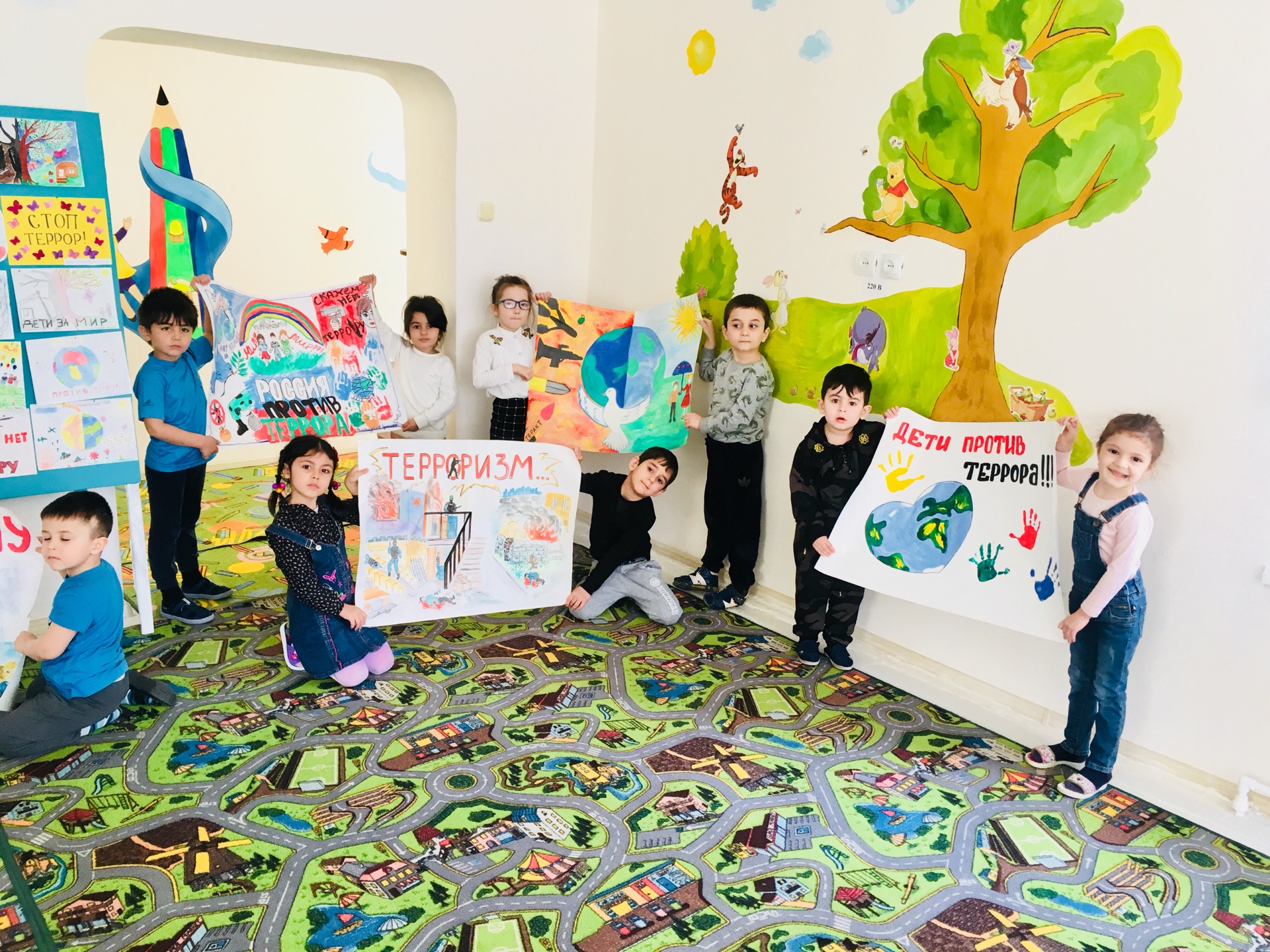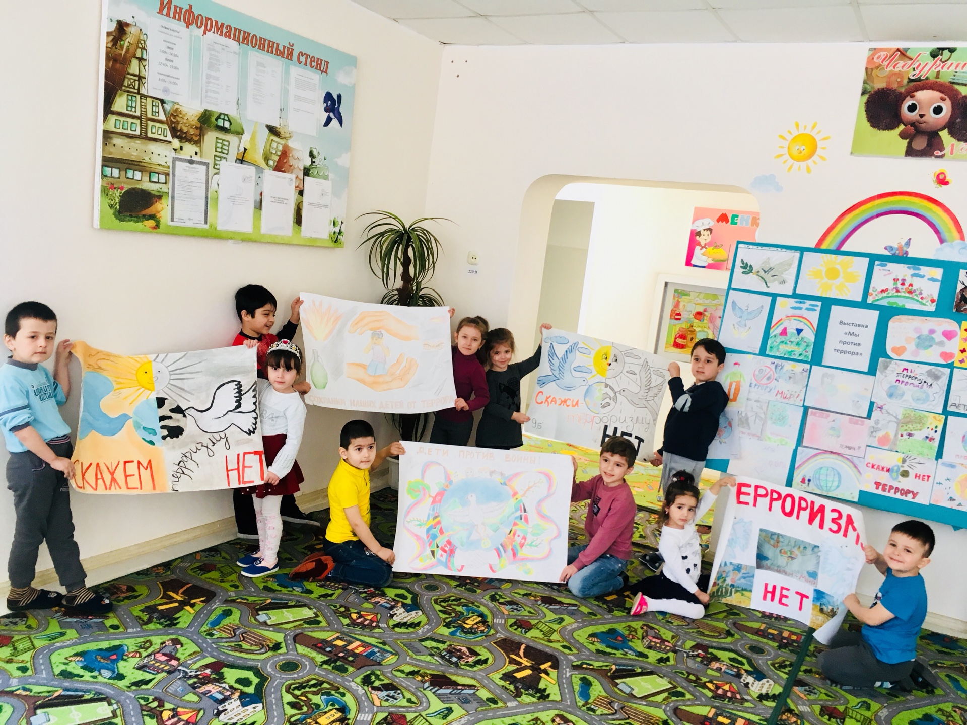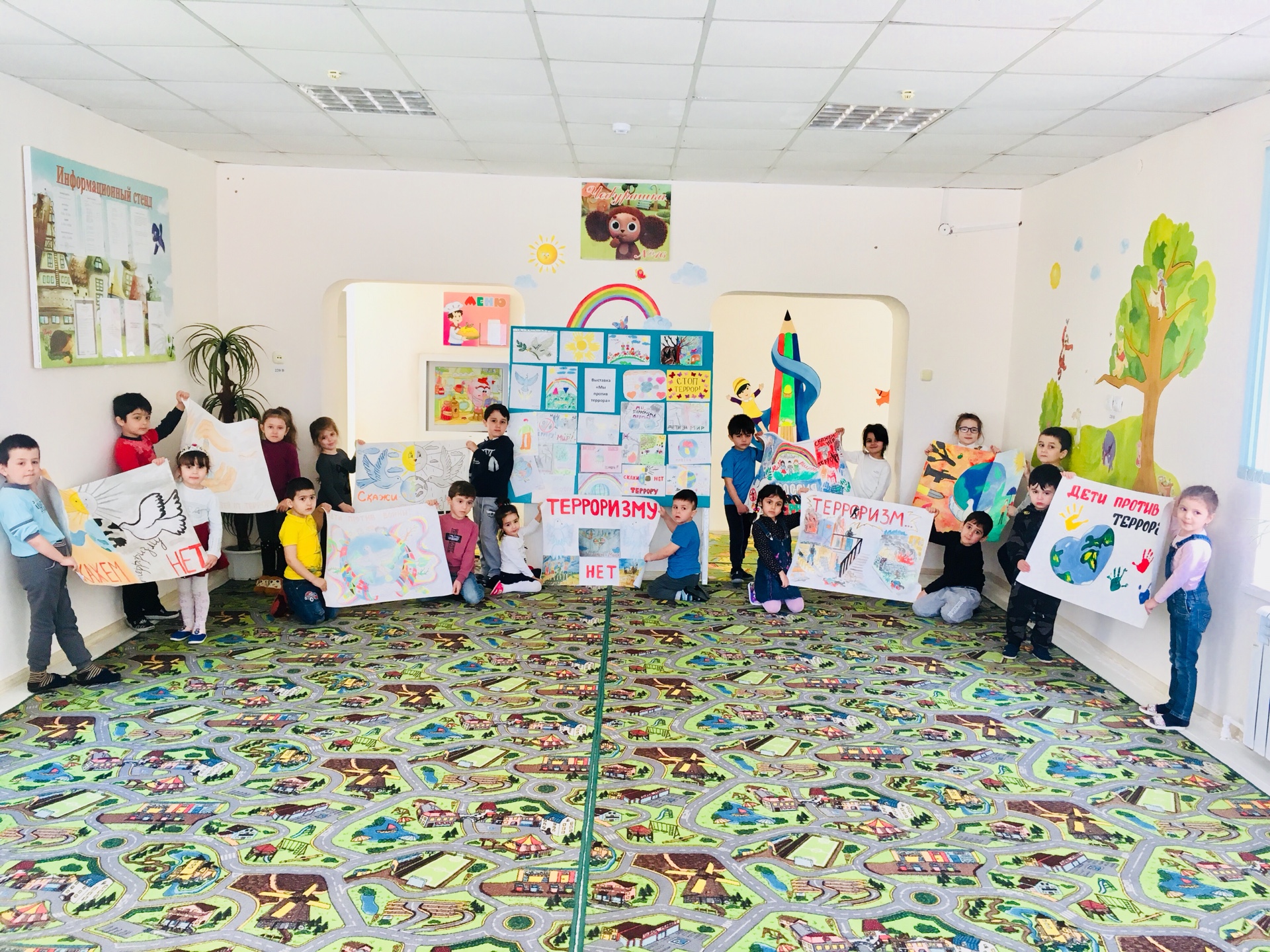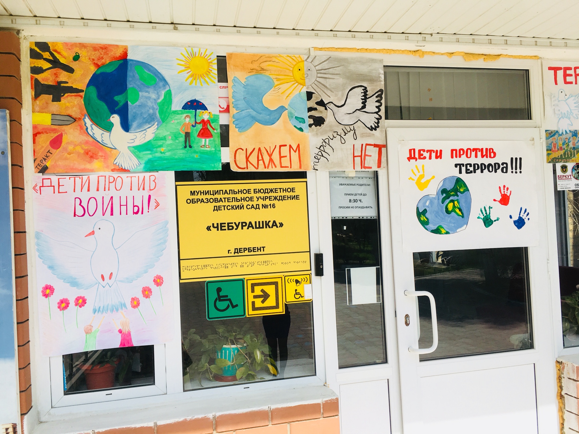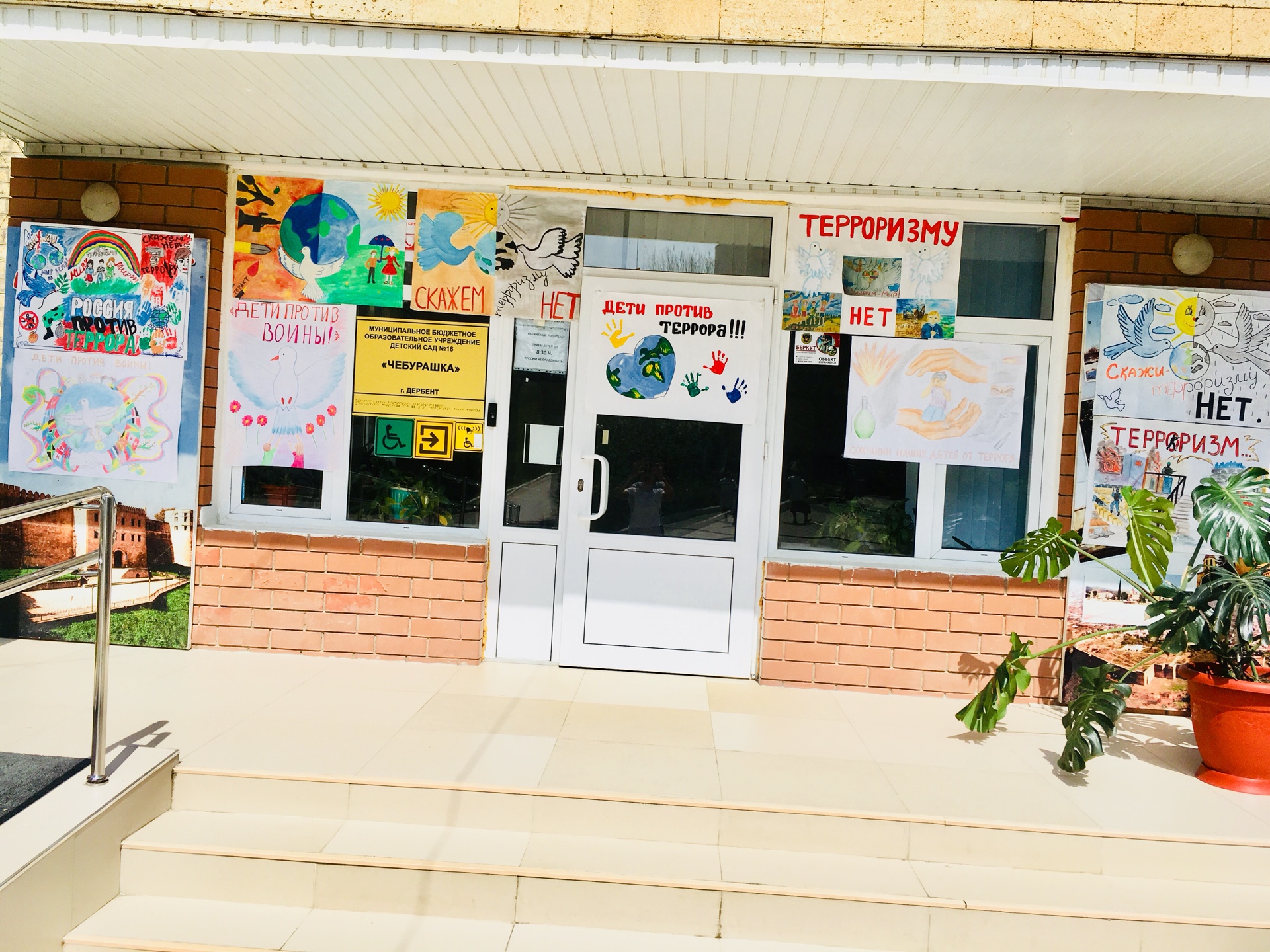 В МБДОУ «Детский сад 16 «Чебурашка» 18 апреля 2018 года в рамках месячника «Три конфессии Дербента вместе против терроризма и экстремизма» была организована и проведена выставка детских плакатов и рисунков «Мы против террора!».