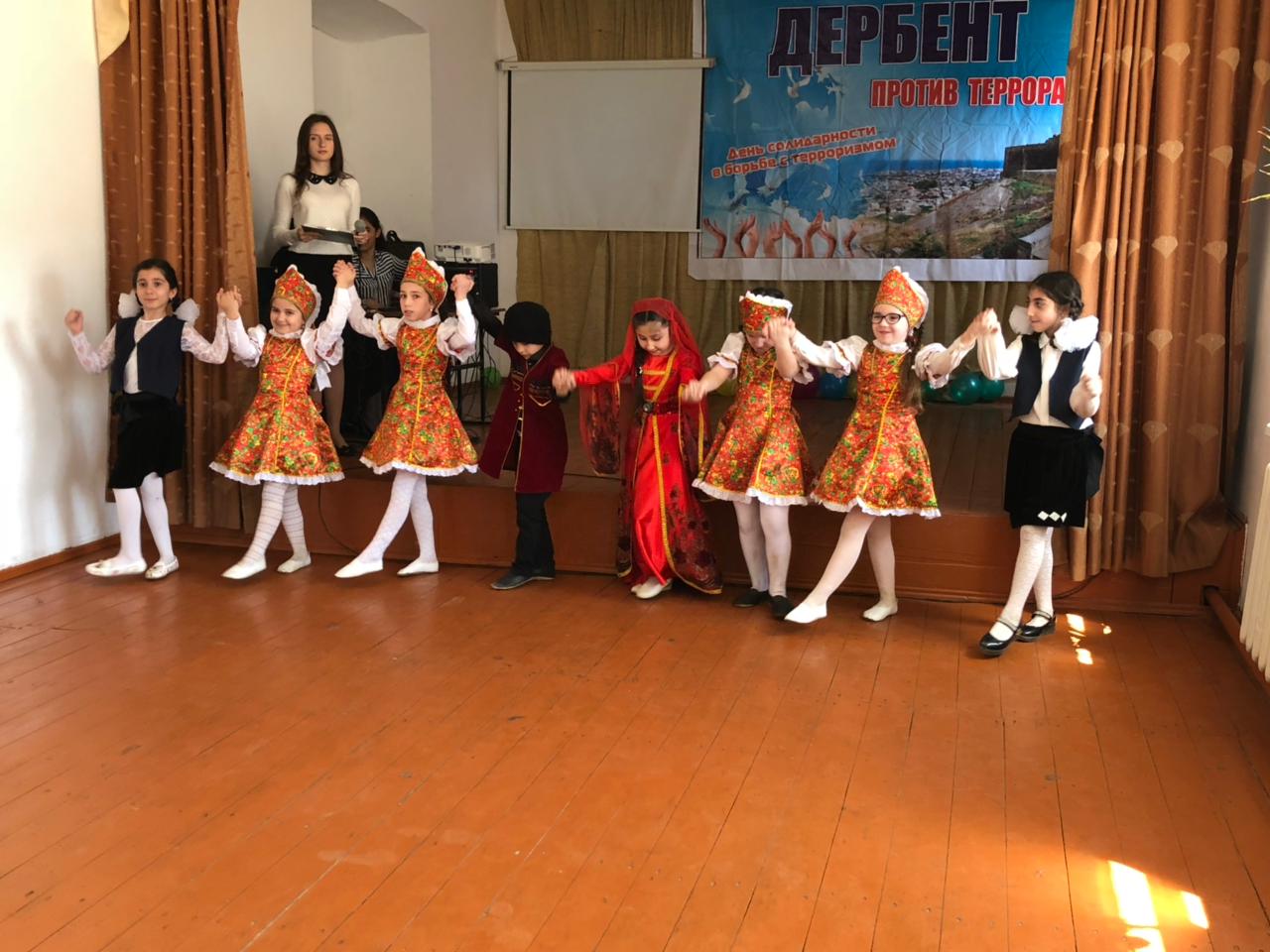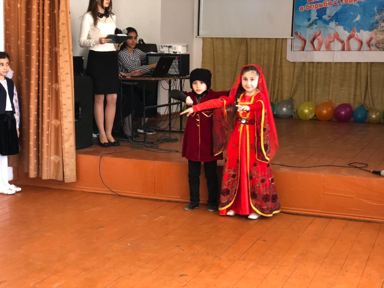 Педагогическим коллективом и учащимися школы было подготовлено красочное выступление. Дети в национальных костюмах исполняли танцы разных народов, зачитали стихи, выступили с призывами к миру.