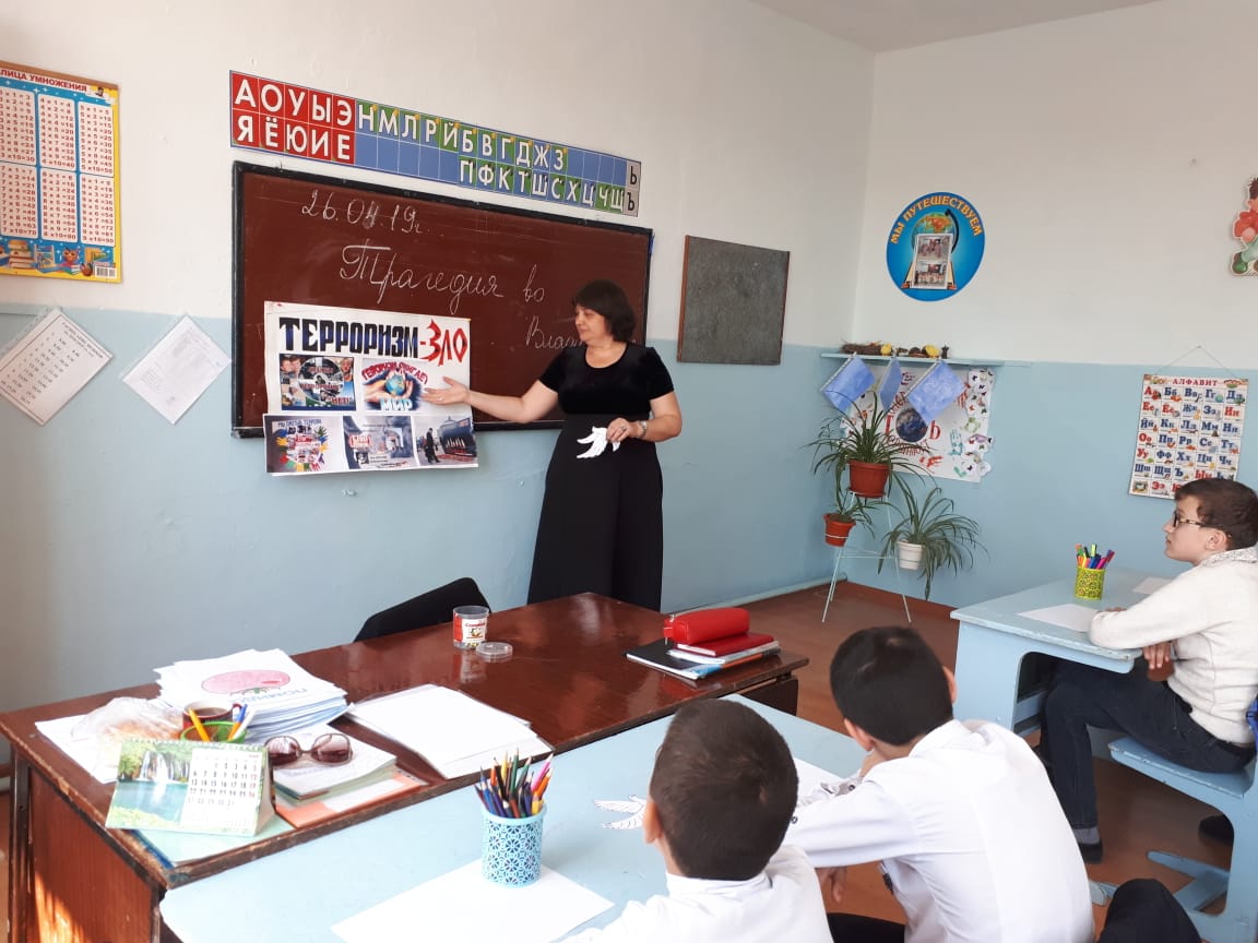 Согласно исполнения «Комплексного плана противодействия идеологии терроризма и экстремизма в РФ на 2019-2023 гг.», с целью предупреждения проявлений религиозного экстремизма и терроризма в молодежной среде, усиления профилактической работы среди подрастающего поколения по неприятию экстремизма и терроризма, в МБОУ Дербентской специальной (коррекционной) общеобразовательной школе-интернате №7 VIII вида прошли пятиминутки и классные часы, посвященные взрыву центрального рынка во Владикавказе.