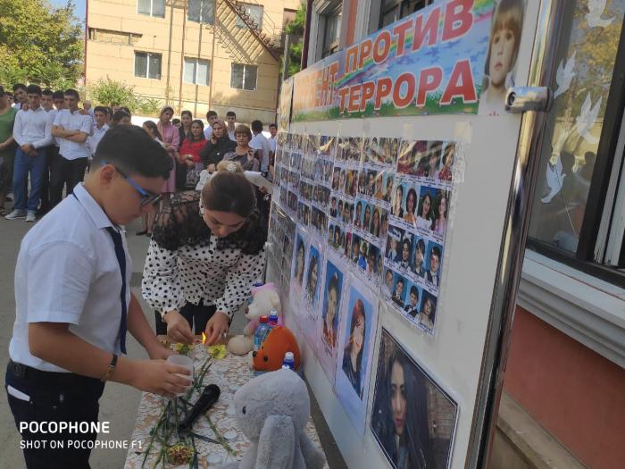 Воспоминания об этом событии не оставляют никого равнодушными. Ученики, учителя слушают рассказ ведущих о трагедии, всколыхнувшей весь мир. Горят свечи, у стены стоят бутылки с водой и мягкие игрушки, фотографии на стенах, плакаты и пронзительная песня, как крик о том, чтобы помнили!