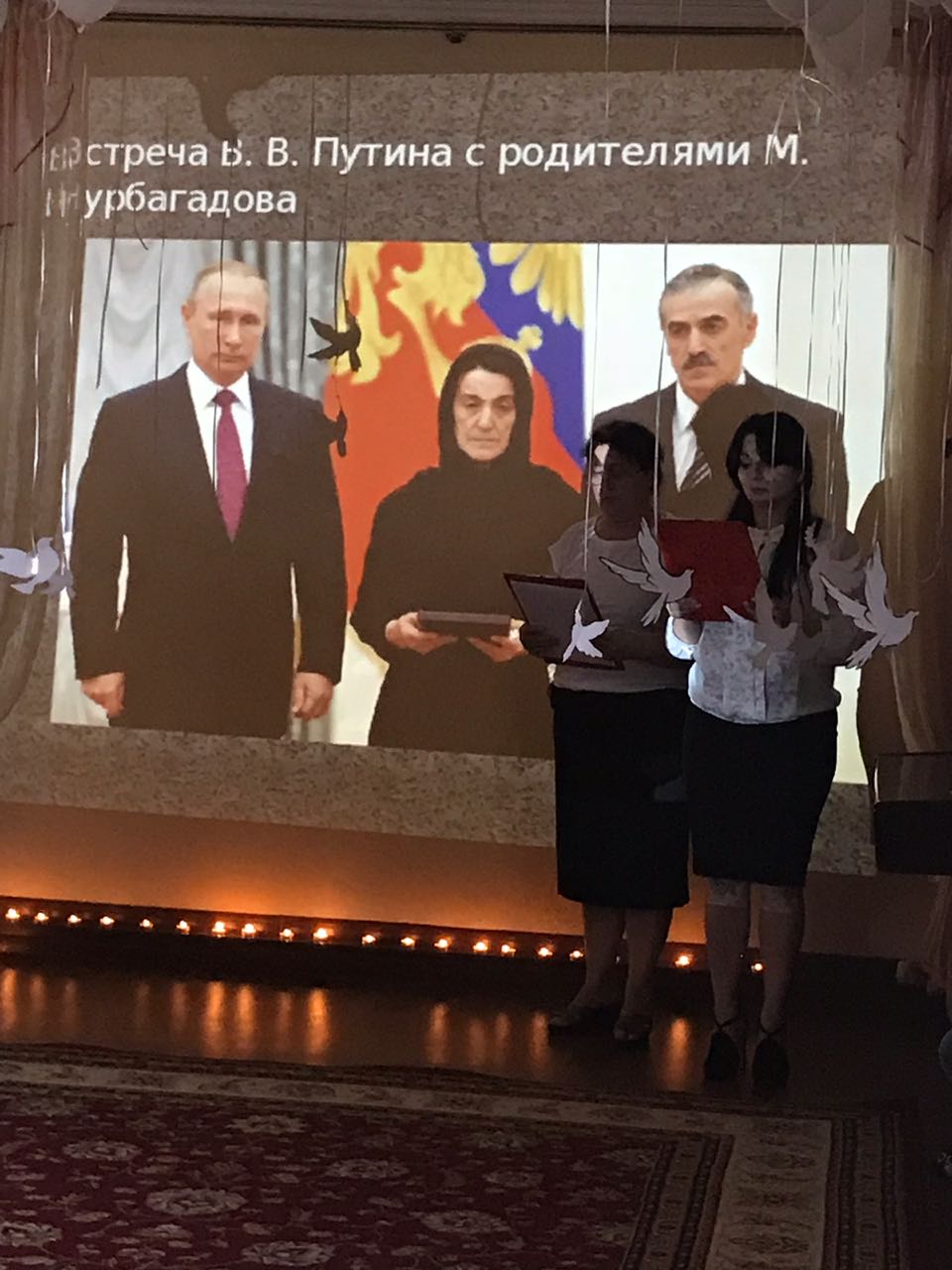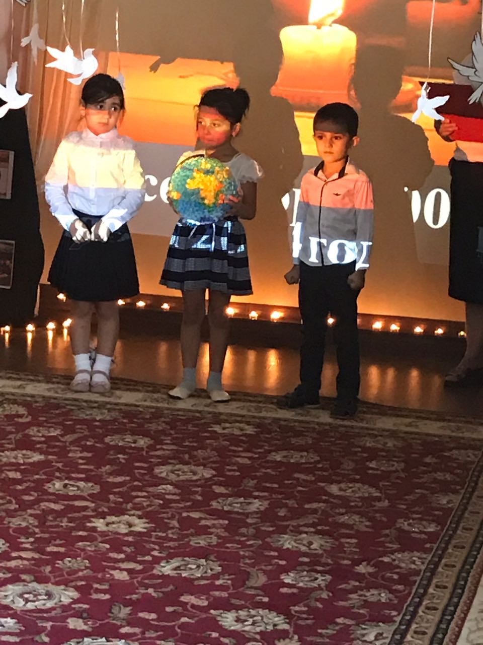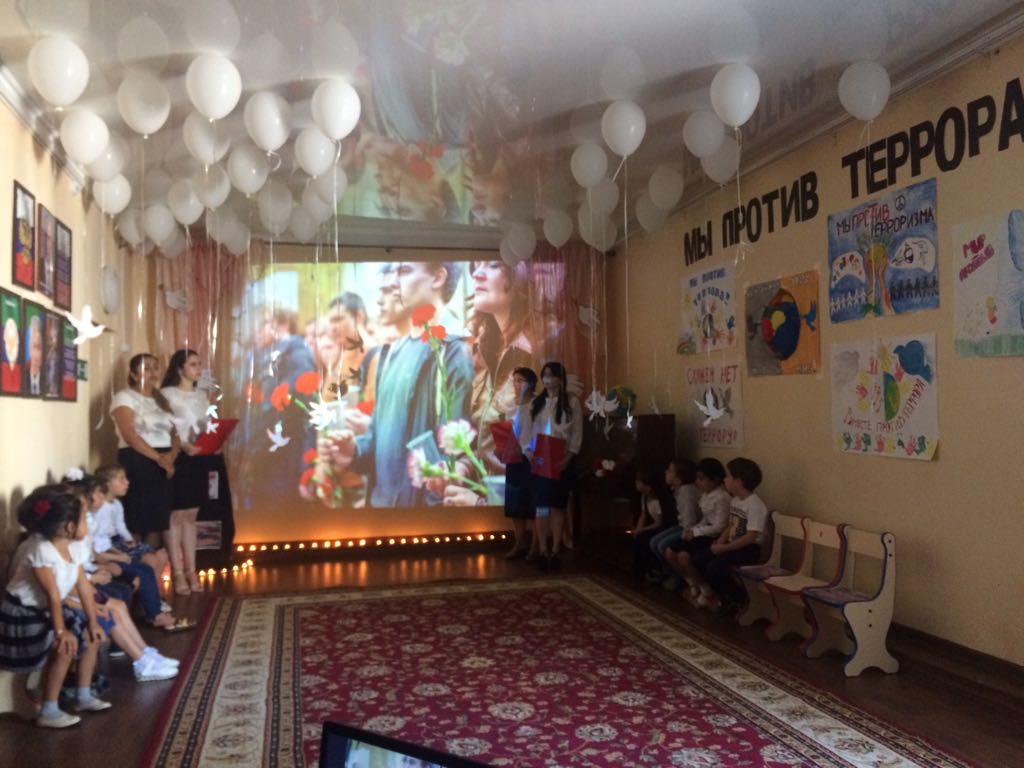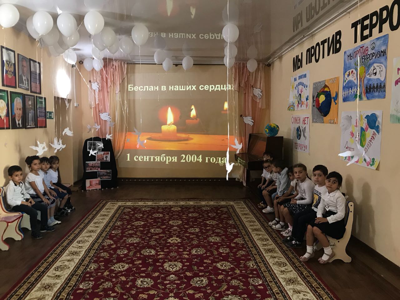 В память о погибших мирных граждан и сотрудников правоохранительных органов детьми и сотрудниками детского сада прочитаны стихи, исполнены песни, зажжены свечи и возложены цветы к портретам жертв, гибель которых стала еще одной страницей в траурной книге последнего тысячелетия.