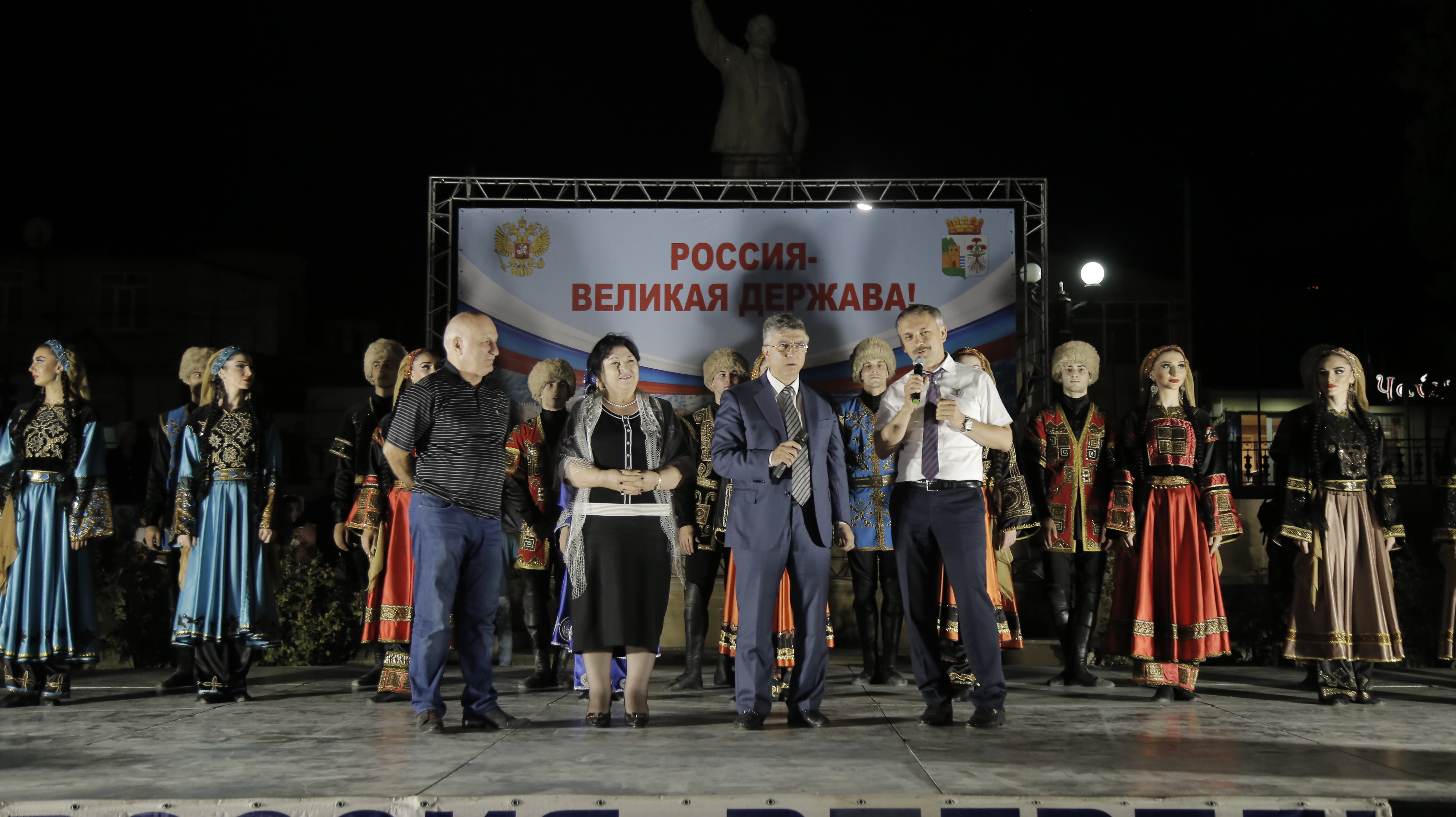 А затем государственный академический заслуженный ансамбль танца Дагестана «Лезгинка» выступил с праздничной программой. Собравшихся на площади приветствовали директор ансамбля — лауреат премии Правительства Российской Федерации, заслуженный деятель искусств России Джамбулат Магомедов, художественный руководитель — заслуженный артист РФ, лауреат премии Правительства Российской Федерации Зулумхан Хангереев.