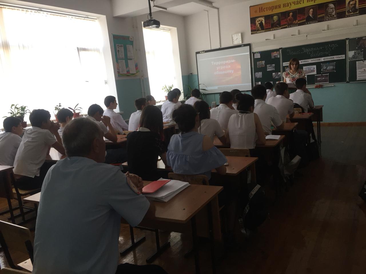 12 сентября 2018 года в рамках общегородского месячника "Мы солидарны в борьбе с терроризмом" в МБОУ СОШ № 15 был проведен открытый урок в 10 «А» классе на тему: «Терроризм - угроза человечеству». Урок провела учитель истории и обществознания Османова К.А.