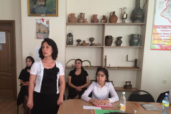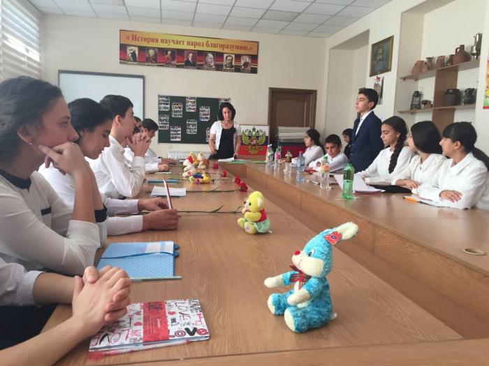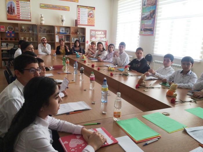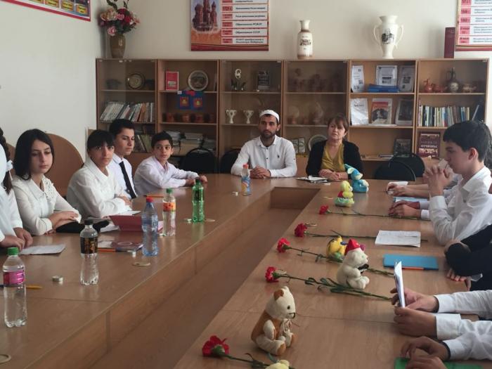 Учитель истории Челебова С.Н. и сотрудник отдела просвещения Муфтията РД Ашуралиев А. познакомили учащихся с хроникой событий, рассказали им о жестокости и бесчеловечности террористов, об отваге и мужестве спецназа, учителей и воспитателей, о страхе детей. Были продемонстрированы слайды с фотографиями и видеороликами о страшных событиях в г. Беслане. Также было отмечено, что события в Беслане – это общая трагедия для всех жителей России и других государств, когда терроризм наглядно продемонстрировал свою звериную жестокость.