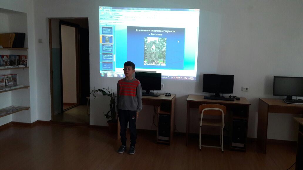 Согласно плану мероприятий месячника «Молодежь Дербента против терроризма» с 25 по 29 сентября работниками читального зала воспитанникам школы- интернат №6 была представлена презентация и документальные фильмы по профилактике терроризма. Данное мероприятие нацелено на формирование общественного мнения, направленного на создание атмосферы нетерпимости к проявлениям экстремистской идеологии, развития кругозора учащихся об экстремизме и терроризме, формирования гражданской позиции подрастающего поколения.