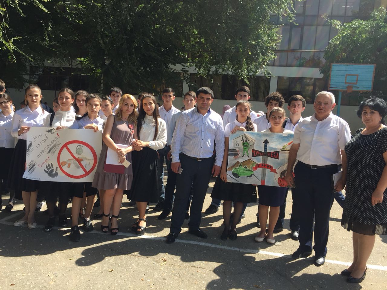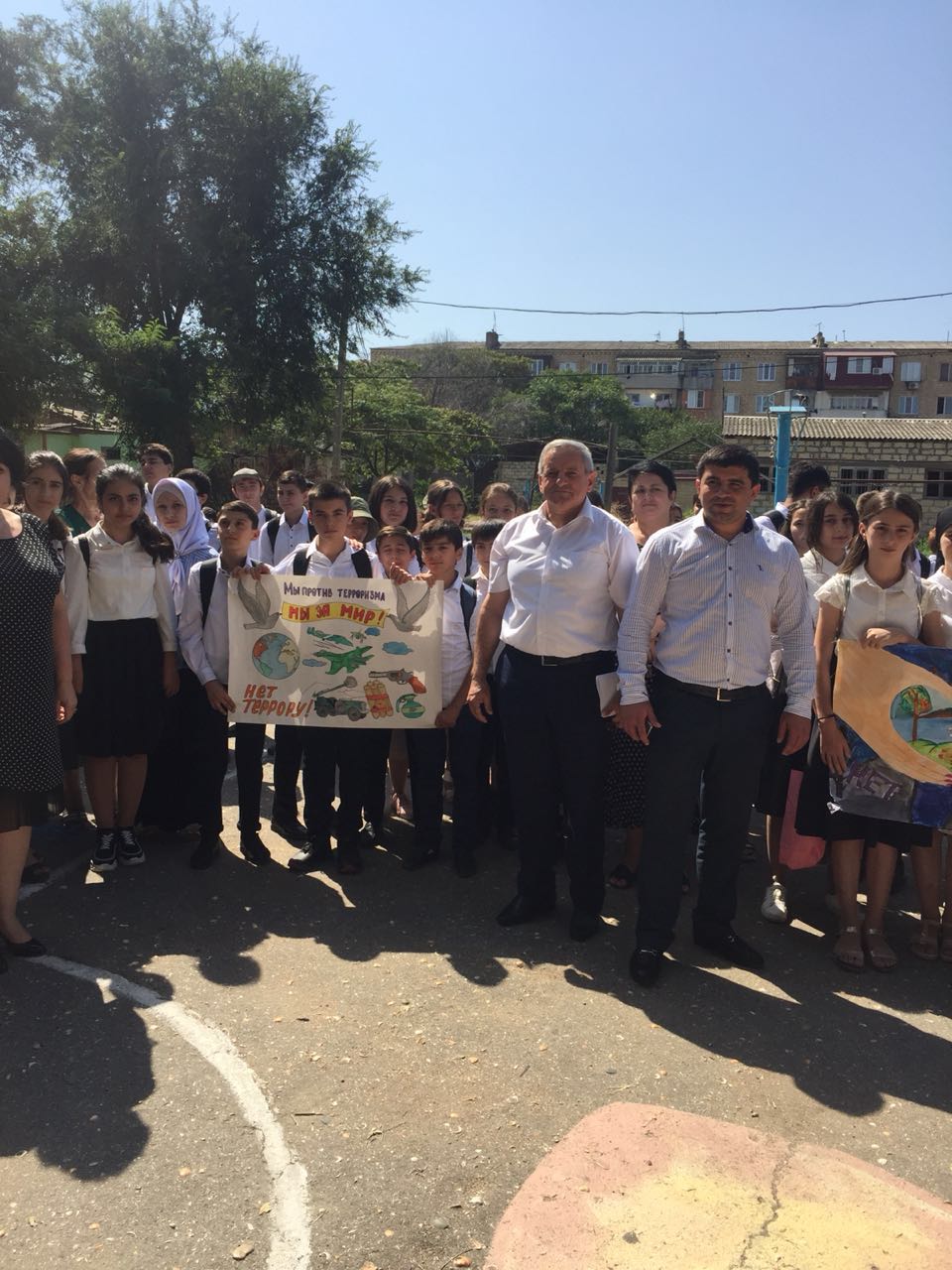 В знак выражения протеста против насилия и террора учащиеся 9-11 х классов школы раздали листовки-памятки всем проходящим горожанам, учащиеся 5-10 классов приняли участие в конкурсе рисунков на асфальте «Нам нужен мир!», в фойе школы выставлен стенд с рисунками детей «Дербент против терроризма».