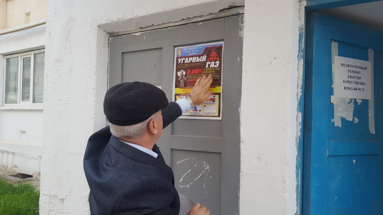 10 марта 2020 года, в рамках мероприятий по обеспечению пожарной безопасности населения и отравлений угарным газом в зимний пожароопасный период 2020 г на территории городского округа «город Дербент» сотрудниками МКУ «Управление по делам ГО и ЧС» была организованна встреча с жильцами ТСЖ «Астра» в ходе которого в жилых многоквартирных домах проведена расклейка памяток с напоминанием для жителей, что самыми распространенными источниками пожаров и отравлений от угарного газа являются неисправные газовые приборы.