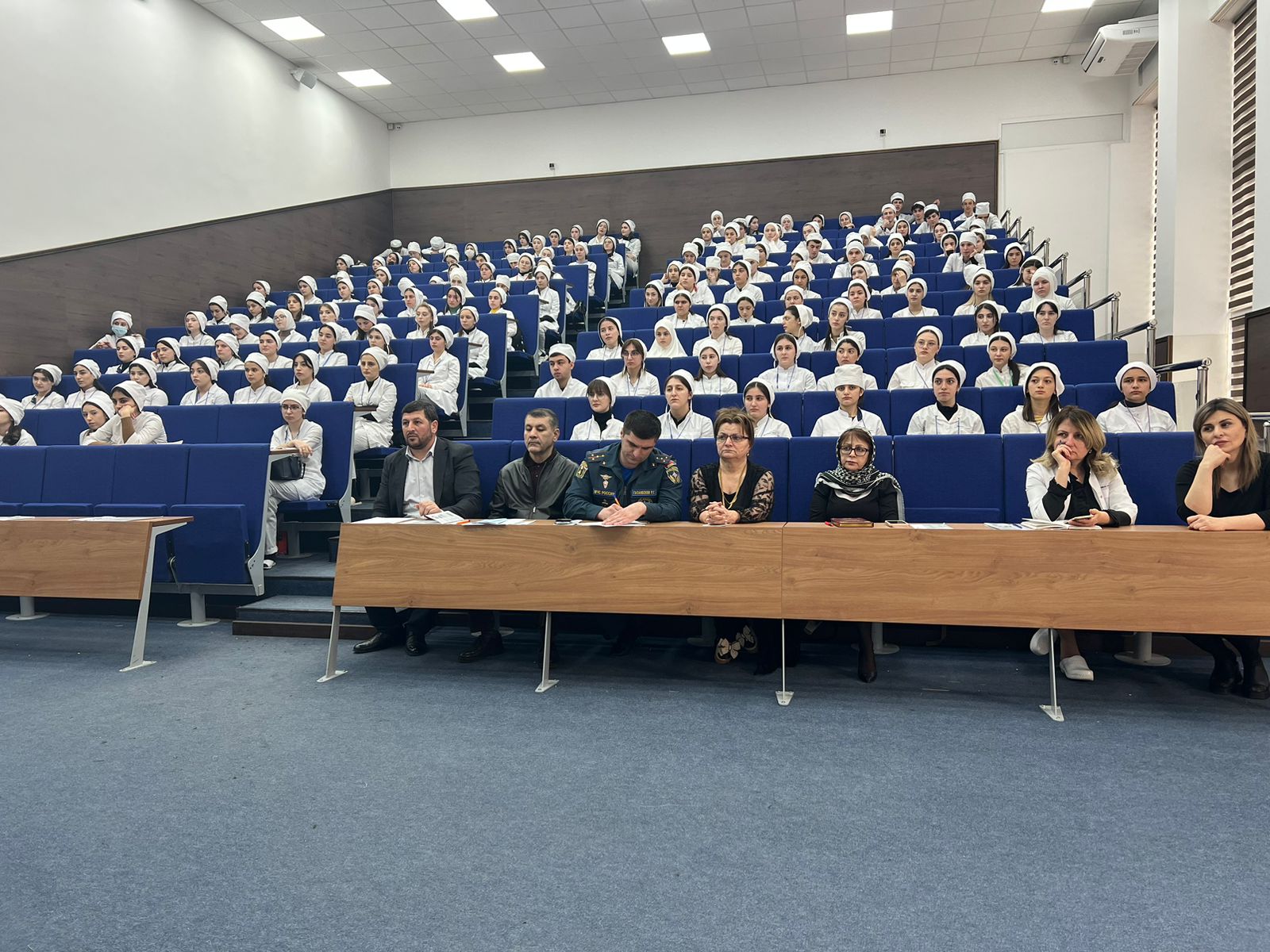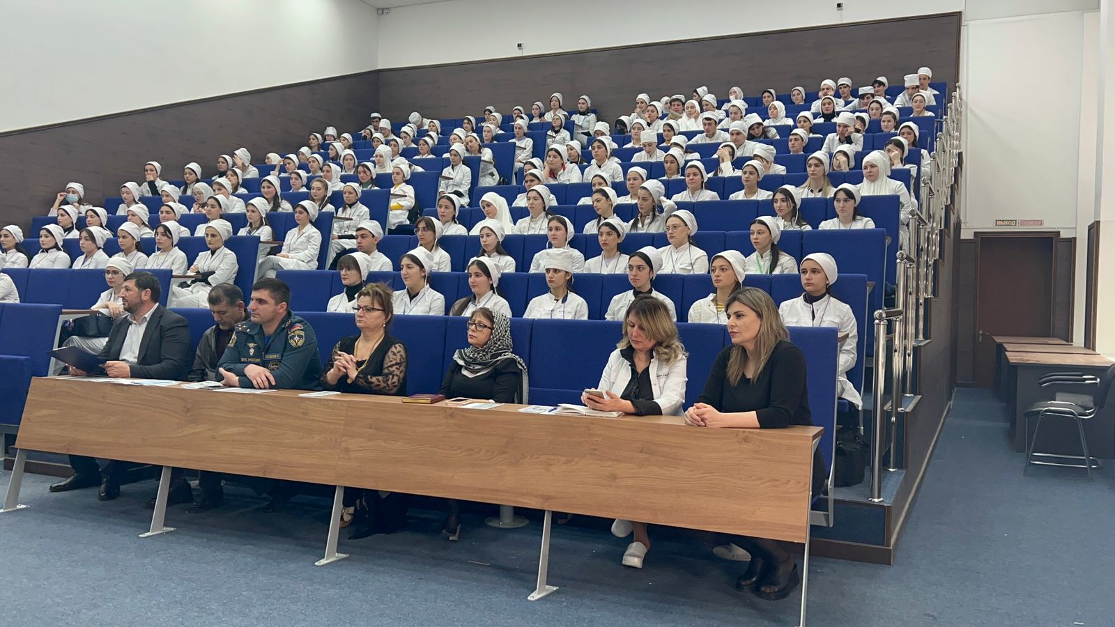 В актовом зале собралисьперсонал и студенты медицинского колледжа.