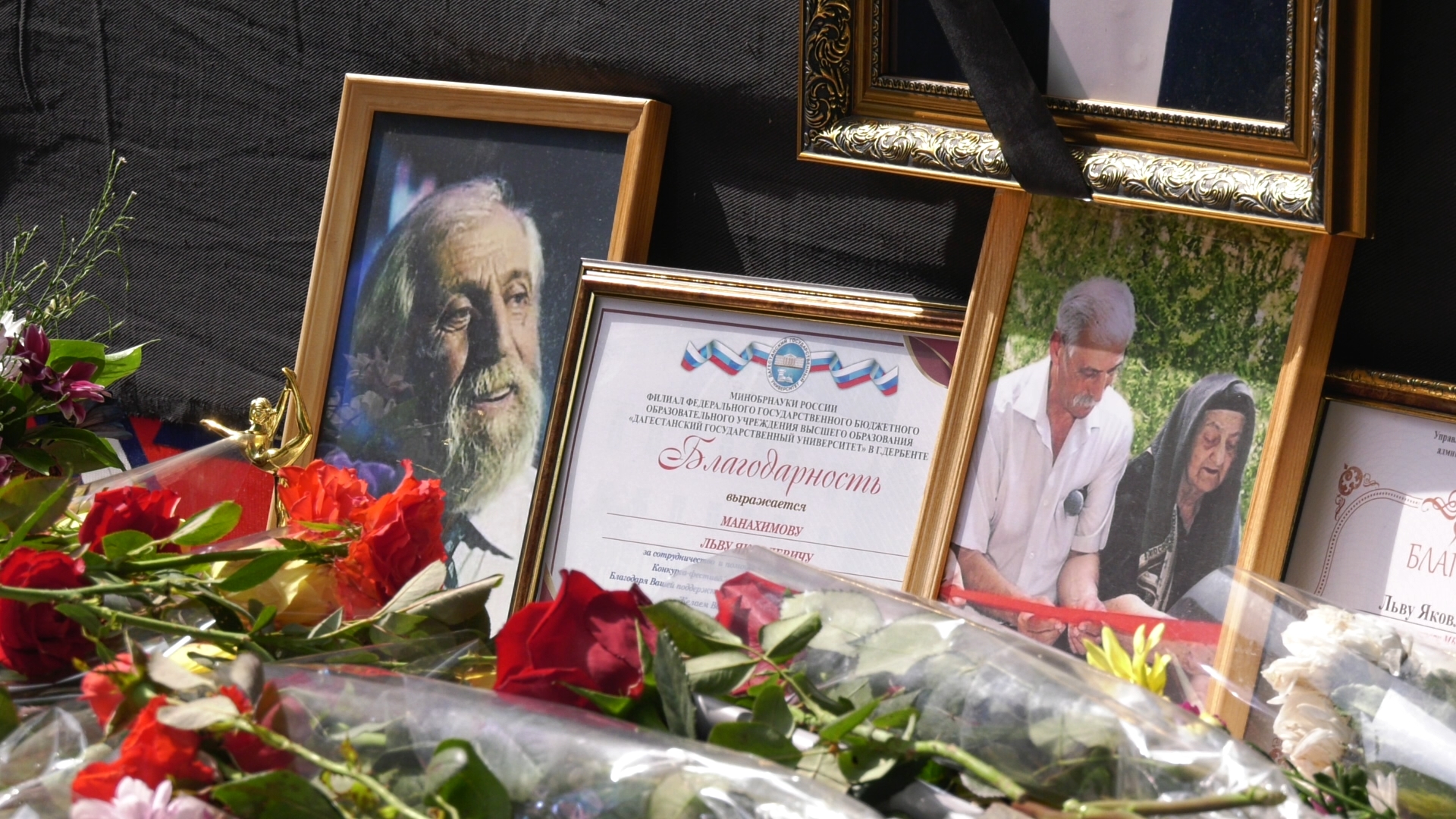 В заключение участники траурного митинга почтили молчанием память Льва Манахимова, выразили соболезнования родным и близким покойного и возложили цветы к его портрету, рядом с которым были расположены многочисленные Дипломы, оригинальные призы и другие награды, завоеванные на региональных конкурсах его воспитанниками.