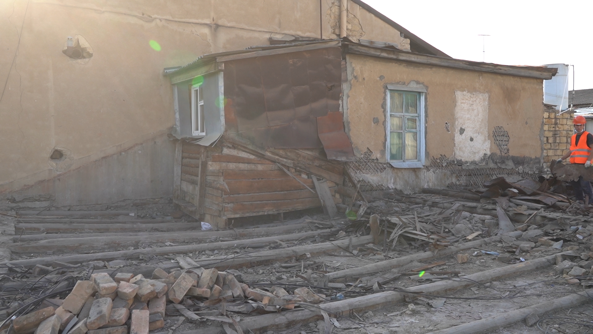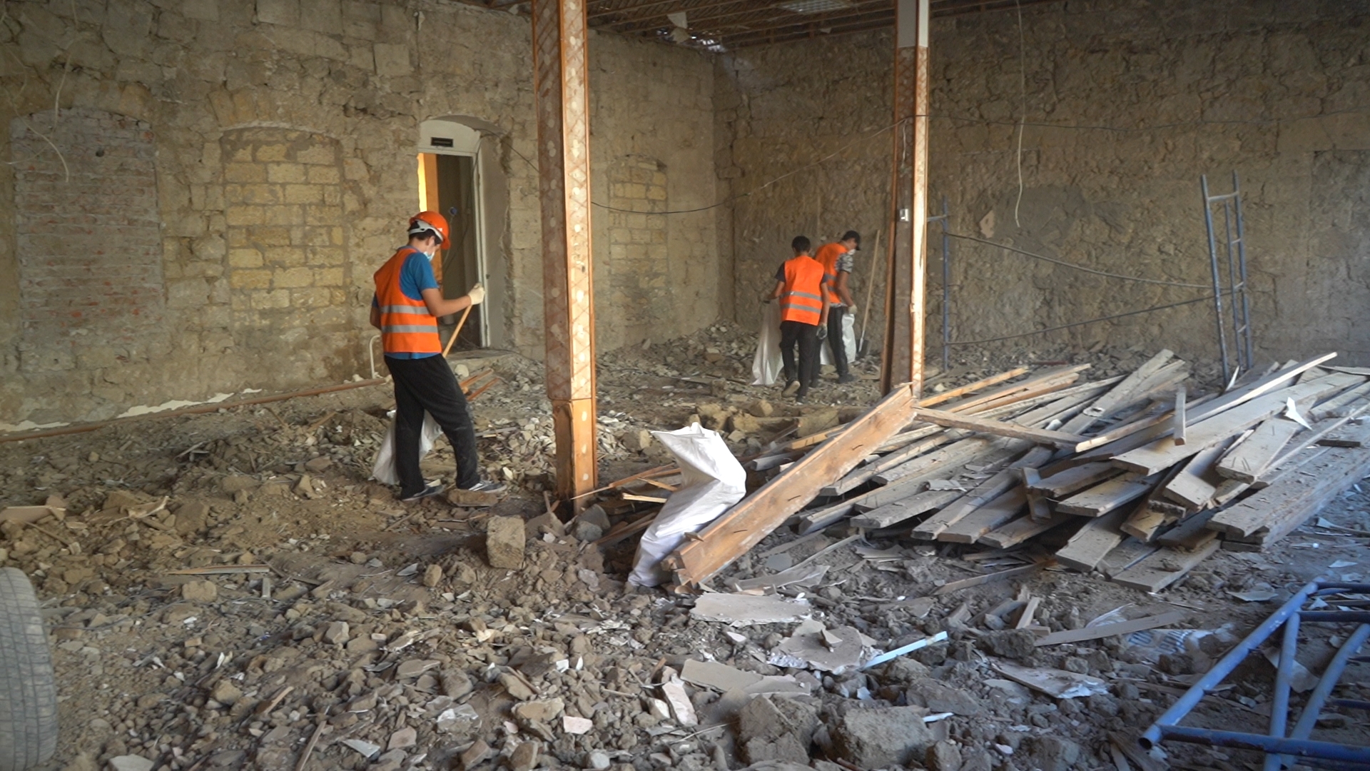 Рабочие уже демонтировали старую крышу и штукатурку со стен. После вскрытия оказалось, что потолки не совсем устойчивые - там прогнили балки, поэтому их тоже будут заменять. Сейчас на объекте ежедневно работают 12-15 человек.